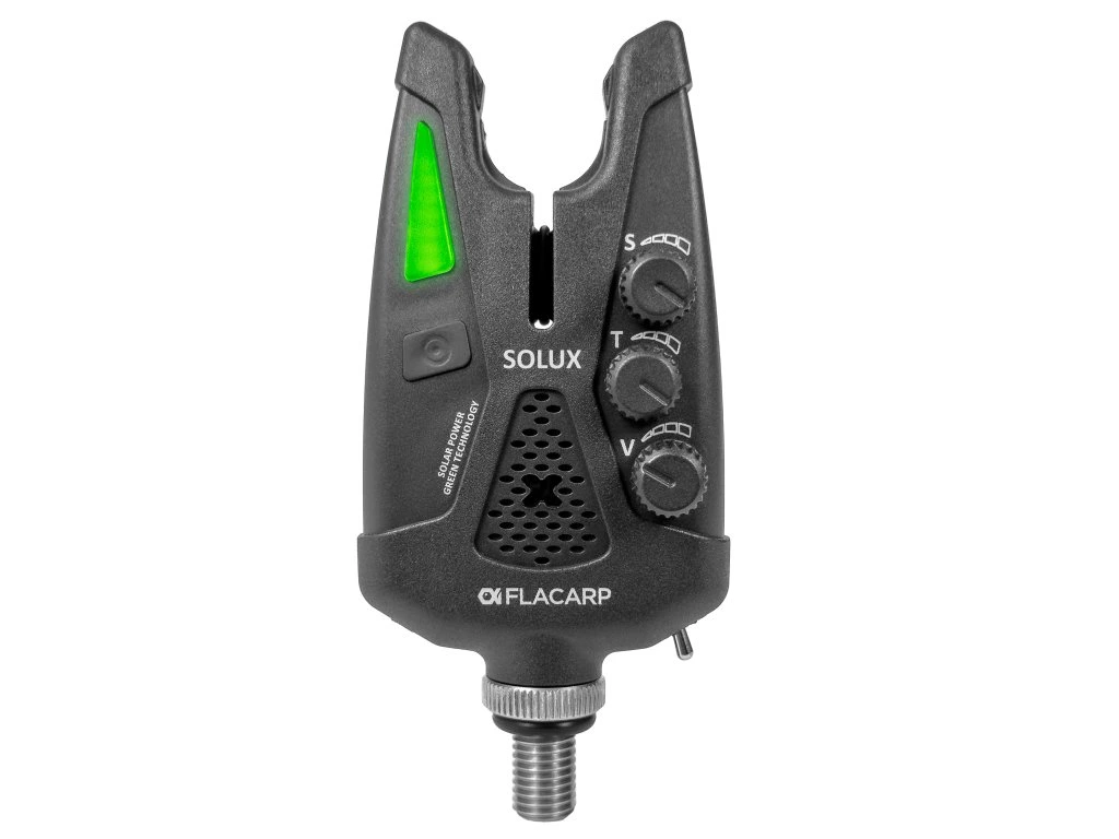 Signalizátor záběru FLACARP SOLUX se solárním nabíjením. Osvědčený design a funkce výkonného hlásiče se vším, co rybář potřebuje, navíc s integrovaným solárním panelem na zadní straně.